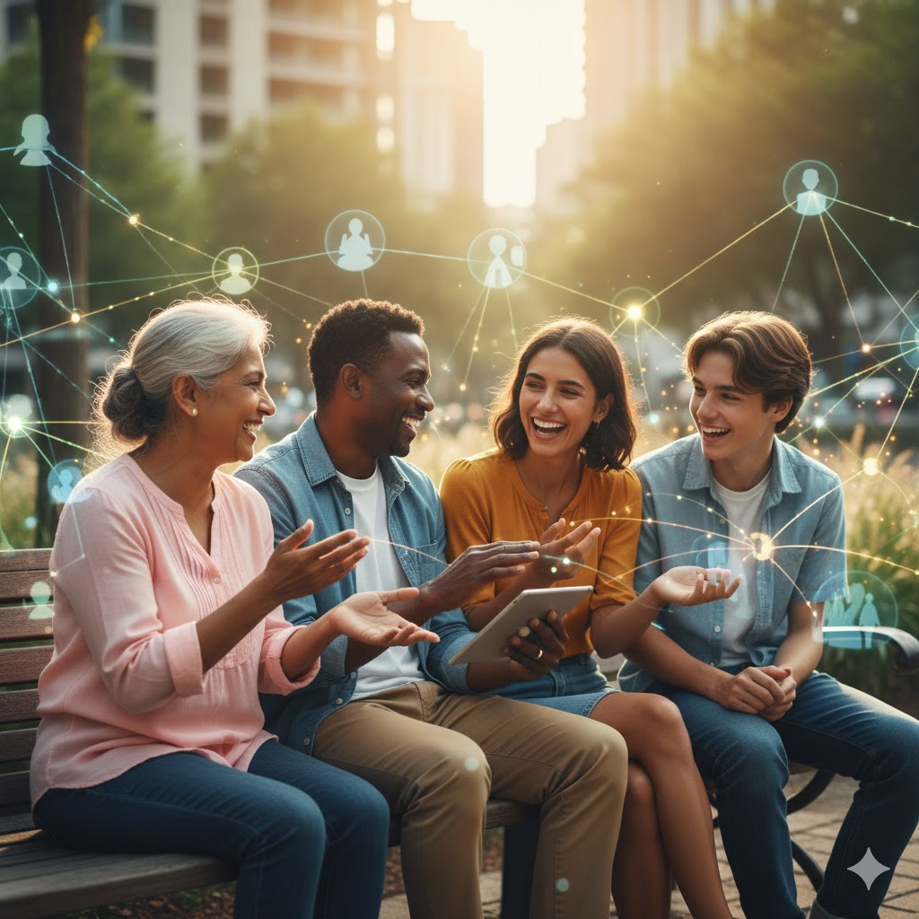 Gemini ha visualizzato per questa pagina il collettivo con le persone che chiacchierano faccia a faccia, e il connettivo con la rete social dello sfondo, i due modi in cui si realizzano le nostre relazioni.